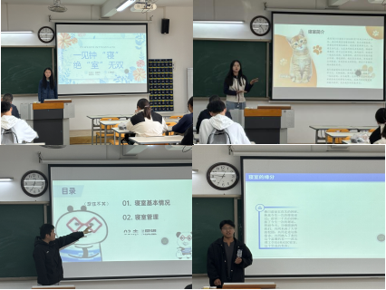 比赛现场,参赛寝室按顺序进行现场展示,各寝室代表分别从“寝室成员、寝室设计、寝室公约、寝室文化、综合特色”五个维度进行了精彩纷呈的汇报展示。他们通过PPT演示、视频记录、现场解说等多种形式详细汇报,大方自信,生动展现了各自寝室的独特魅力。这些寝室各具特色,他们在寝室文化的传承、学术氛围的营造、团队精神的展现以及个人素质的提升等方面都做出了表率。他们的寝室不仅整洁有序,而且充满了温馨和谐的生活气息,充分体现了同学们在校期间积极向上的生活态度和勤奋好学的精神风貌。